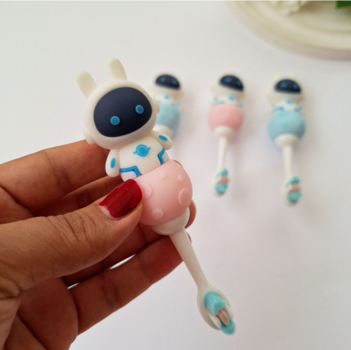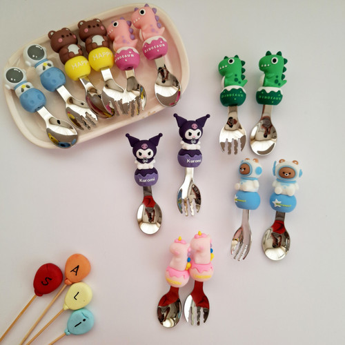 ست قاشق و چنگال استیل بچگانه فانتزی دسته سیلیکونی تدی، دایناسور، کرومی و آدم فضایی
