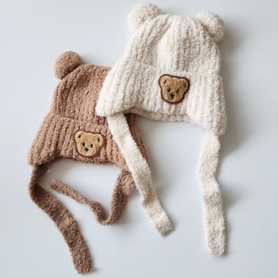 کلاه زمستانی بچگانه ۲ تا ۶ سال رنگ سفید و کرم و نسکافه ای تدی گرم شیک بنددار و گره ای