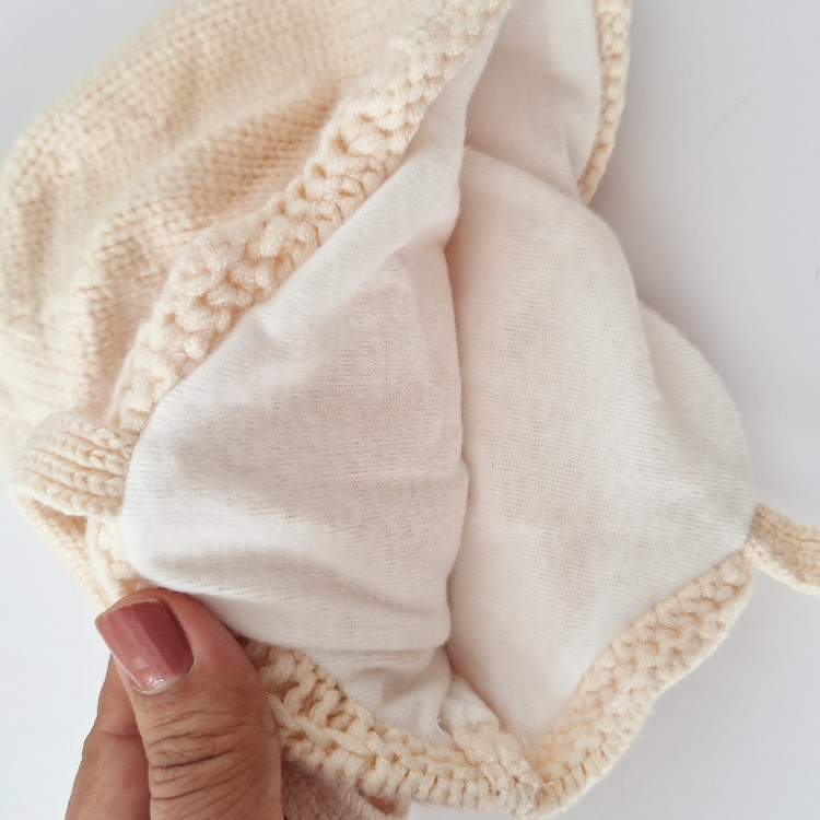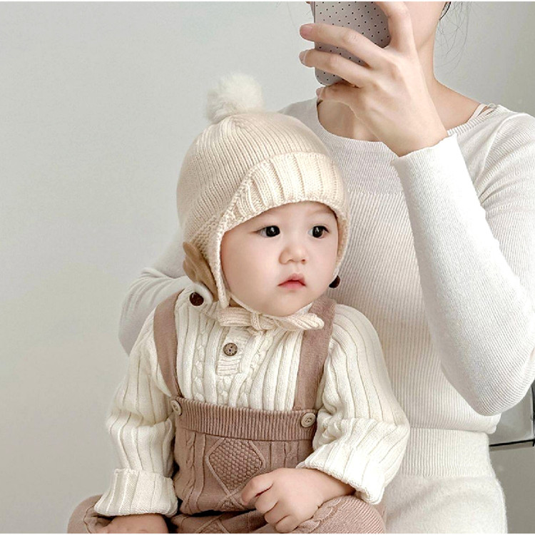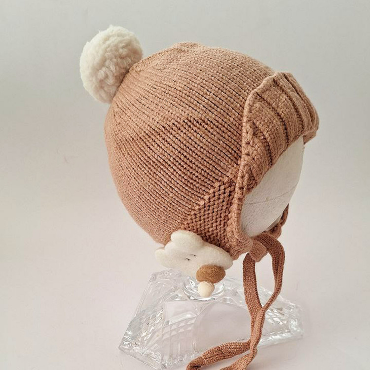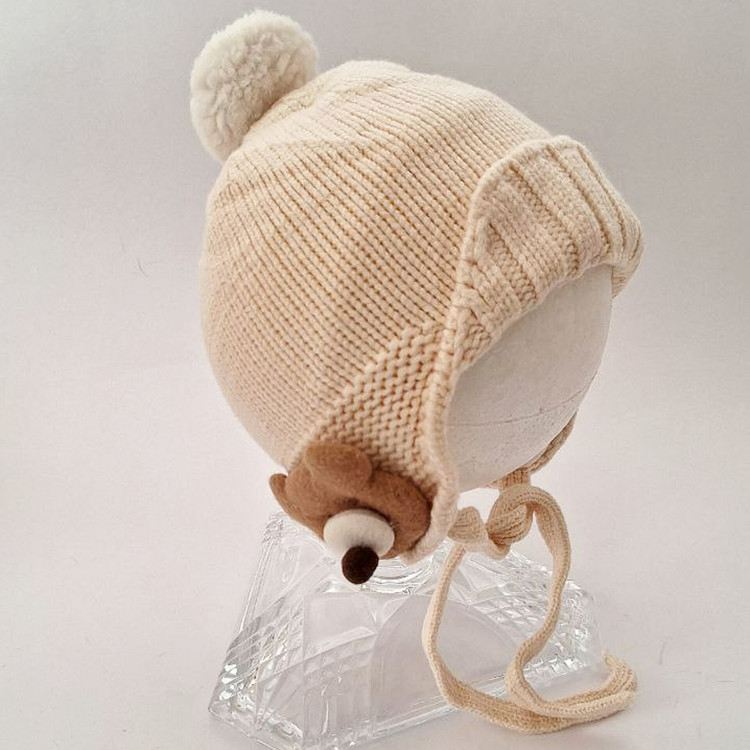 کلاه بافت نوزادی و بچگانه زمستانی ۳ماه تا ۲سال رنگ کقهوه ای تدی گرم شیک بنددار و گره ای و آستردار
