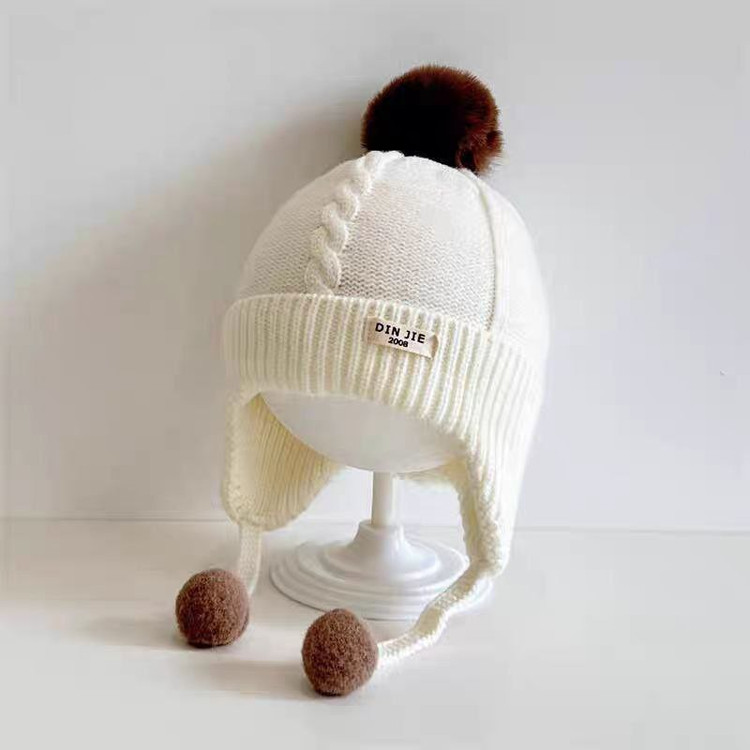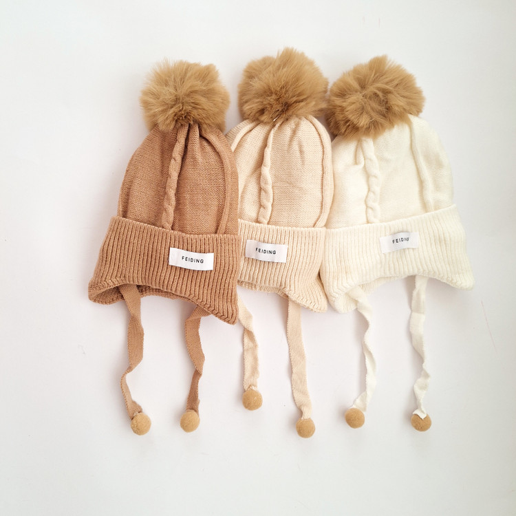 کلاه بافت زمستانی نوزادی بچگانه پومدار بند دار آسترداره ۴ ماه تا ۲سال