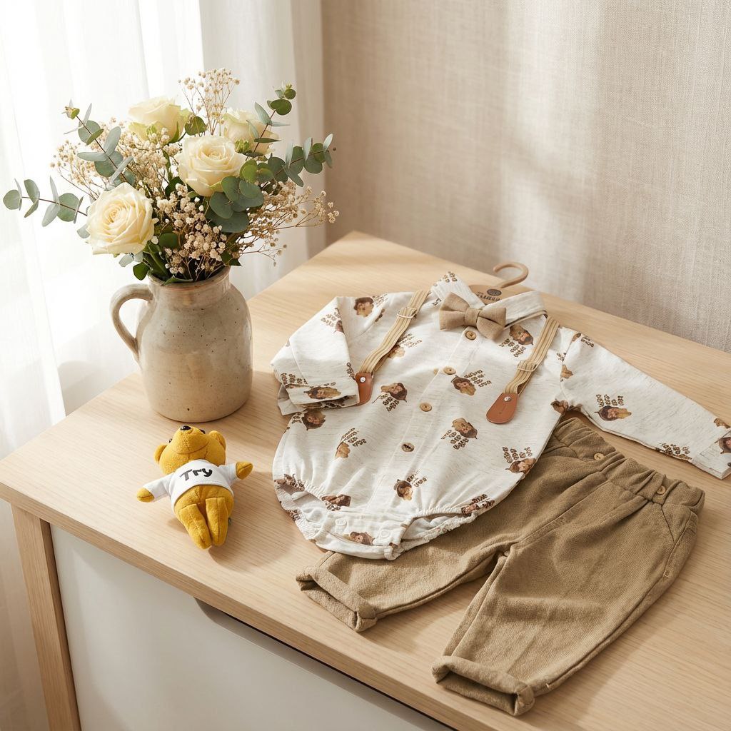 لباس ست بادی شلوار دوبنده ساسبندی نوزادی و بچگانه پسرانه وارداتی سایزبندی از ۶ماه تا ۲سال