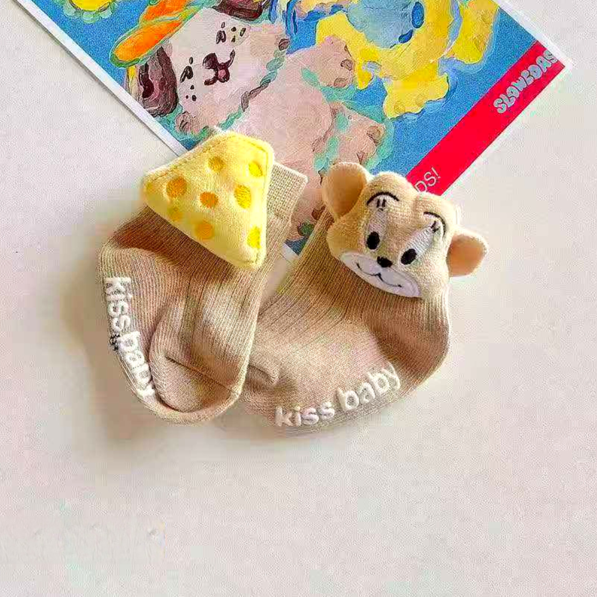 جوراب نوزادی و بچه گانه عروسک برجسته نیمساق ترمزگیر استپ دار رنگ کرم موش و پنیر